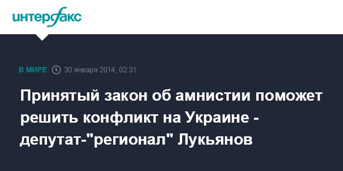 Москва. 30 января. INTERFAX.RU - Народный депутат Владислав Лукьянов (фракция Партии регионов) считает принятый Верховной Радой Украины закон об амнистии в редакции Юрия Мирошниченко важным для решения конфликтной ситуации в стране.