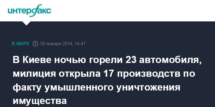 Вместе с тем, в отделе по связям с общественностью МВД Украины в г.Киеве сообщили, что в течение ночи по спецлинии "102" из разных районов Киева поступило 17 сообщений о возгорании автомобилей, в связи с чем столичная милиция проводит расследование.