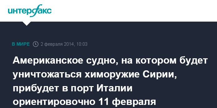 Американское судно, на котором будет уничтожаться химоружие Сирии, прибудет в порт Италии ориентировочно 11 февраля