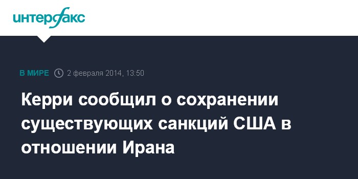 Москва. 2 февраля. INTERFAX.RU - Госсекретарь США Джон Керри в воскресенье сообщил главе иранского МИД Джаваду Зарифу, что Вашингтон продолжит применять существующие в отношении Ирана санкции, сообщил западным журналистам неназванный представитель госдепартамента. "Госсекретарь Керри ясно дал понять, что США продолжат применять существующие санкции", - сказал он.