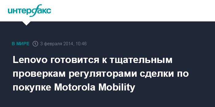 Москва. 3 февраля. INTERFAX.RU - Покупка компанией Lenovo подразделения Google Inc. по выпуску мобильных телефонов - Motorola Mobility - за $2,9 млрд будет внимательно проверяться американским регулятором, отслеживающим международные сделки, на предмет угрозы национальной безопасности, пишет газета Financial Times.