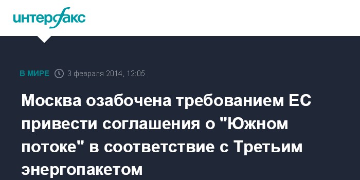 Москва. 3 февраля. INTERFAX.RU - Глава МИД России Сергей Лавров выразил озабоченность заявлениями представителей ЕС о необходимости приведения межправсоглашений между РФ и странами-участницами проекта "Южный поток" в соответствие с требованиями Третьего энергетического пакета.