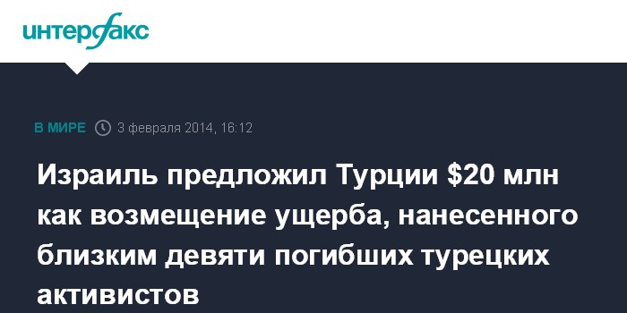 Москва. 3 февраля. INTERFAX.RU - Власти Израиля готовы выплатить правительству Турции $20 млн как возмещение ущерба, нанесенного близким погибших активистов из Турции в результате атаки израильских ВМС на "Флотилию свободы" в 2010 году, пишет в понедельник газета Haaretz.