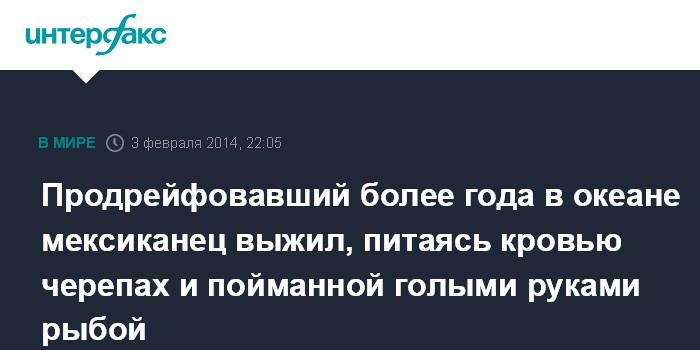 Лондон. 3 февраля. INTERFAX.RU - Мексиканский рыбак, более года дрейфовавший в Тихом океане, рассказал, что пил черепашью кровь, дождевую воду и мочу, чтобы не умереть, пишет во вторник британская газета Daily Telegraph.
