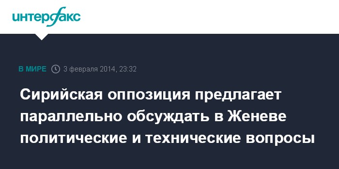 Москва. 3 февраля. INTERFAX.RU - Сирийская оппозиция выступает за то, чтобы на втором раунде межсирийского диалога в Женеве действовали своего рода рабочие группы, которые параллельно решали бы технические и политические вопросы.