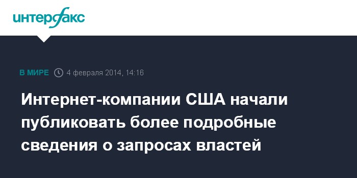 Москва. 4 февраля. INTERFAX.RU - Американские IT-компании Google, Microsoft, Yahoo!, Facebook, LinkedIn и Tumblr по соглашению с министерством юстиции США, заключенному на предыдущей неделе, опубликовали более подробные данные о числе запросов властей о предоставлении персональных данных пользователей по делам, касающимся вопросов национальной безопасности.