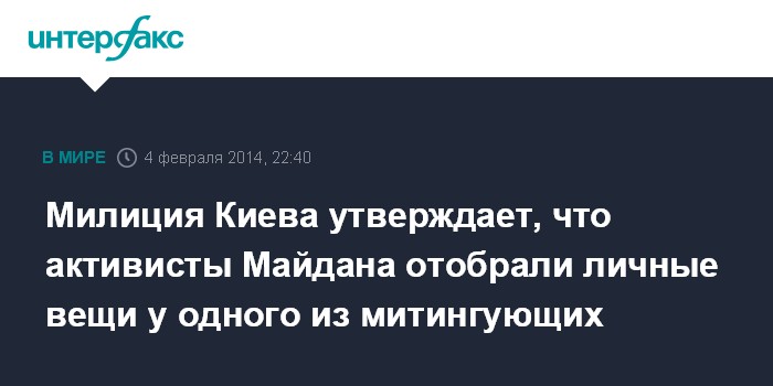 По данным УСО МВД Украины в г.Киеве, около 21:00 3 февраля в милицию позвонил 19-летний молодой человек, который сообщил, что на Майдане люди в касках отобрали у него личные вещи.