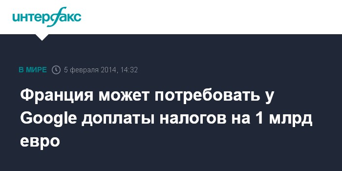Париж. 5 февраля. INTERFAX.RU - Франция, возможно, потребует от Google Inc. заплатить налоги в сумме 1 млрд евро, написал в среду французский журнал LePoint на своем сайте, сославшись на неназванные источники в правительстве и парламенте страны.