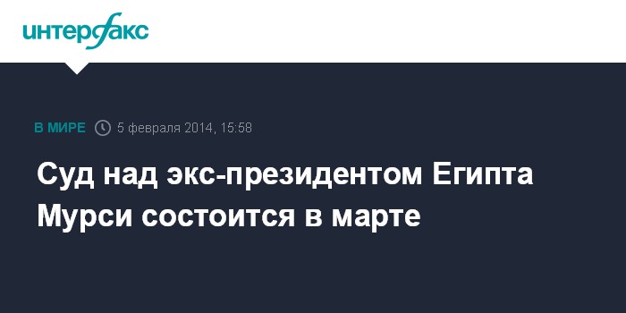 Москва. 5 февраля. INTERFAX.RU - Судебный процесс над бывшим египетским президентом Мухаммедом Мурси по делу о гибели демонстрантов перенесен на 1 марта этого года, сообщает веб-сайт ливанской газеты Daily Star.