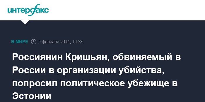 Москва. 5 февраля. INTERFAX.RU - Россиянин Михаил Кришьян, обвиняемый в России в организации заказного убийства и в рейдерском захвате, попросил в Эстонии политическое убежище, сообщил в среду портал телерадиовещания ERR.