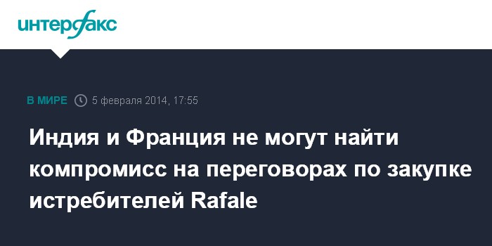 Москва. 5 февраля. INTERFAX.RU - Переговоры по многомиллиардной сделке на покупку Индией 126 истребителей Rafale в Индию зашли в тупик, сообщает американский оборонный Интернет-портал Defensenews со ссылкой на источники в индийском военном ведомстве.
