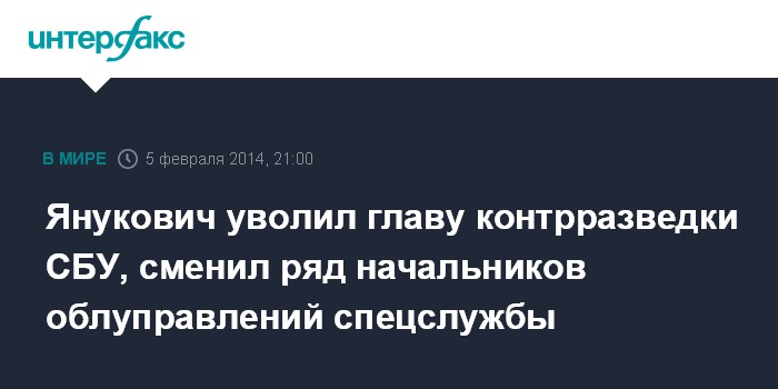 Москва. 5 февраля. INTERFAX.RU - Президент Виктор Янукович сменил ряд руководителей управлений Службы безопасности Украины в областях страны, а также руководителей департаментов контрразведки и контрразведывательной защиты интересов государства.