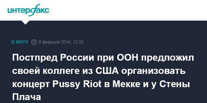 Постпред России при ООН предложил своей коллеге из США организовать концерт Pussy Riot в Мекке и у Стены Плача