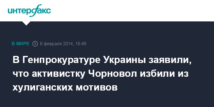 Киев. 6 февраля. ИНТЕРФАКС-УКРАИНА - На активистку Евромайдана и журналистку Татьяну Чорновол напали из хулиганских побуждений - за то, что она подрезала автомобиль на дороге. Расследование завершено, заявляет замгенпрокурора Украины Роман Андреев.