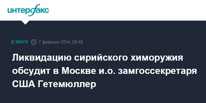 Ликвидацию сирийского химоружия обсудит в Москве и.о. замгоссекретаря США Гетемюллер
