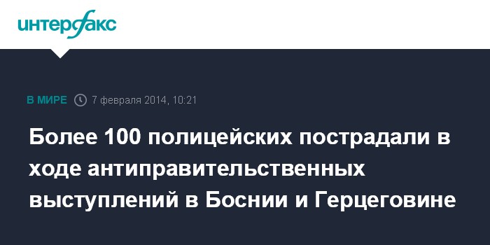 Брюссель. 7 февраля. INTERFAX.RU - Более 130 человек получили ранения во время второго дня антиправительственных манифестаций в боснийском городе Тузла.