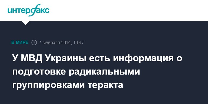 Киев. 7 февраля. INTERFAX.RU - У Министерства внутренних дел Украины есть оперативная информация о подготовке праворадикальными группировками террористического акта.
