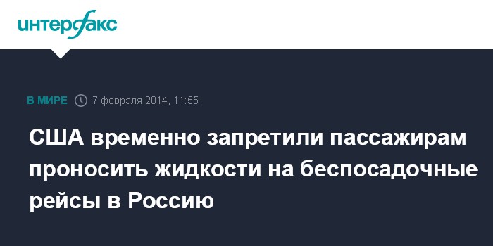 Лондон. 7 февраля. INTERFAX.RU - Американские власти ввели временные ограничения на пронос в ручной клади жидкостей пассажирами лайнеров, совершающих прямые рейсы в Россию.