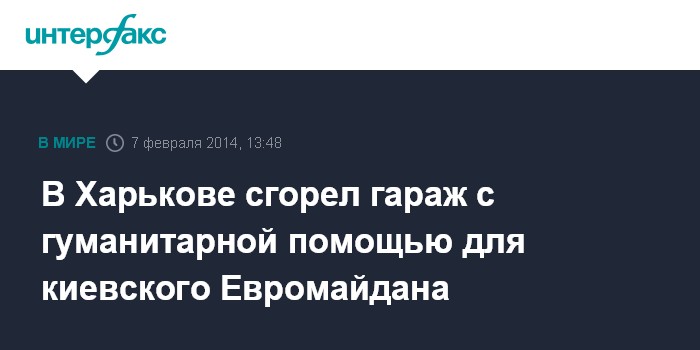 Москва. 7 февраля. INTERFAX.RU - В Харькове в пятницу утром сгорел гараж, в котором хранилась гуманитарная помощь, собранная для Евромайдана в Киеве.