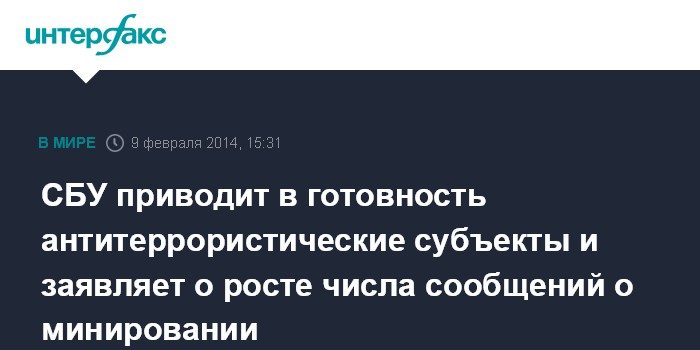 Москва. 9 февраля. INTERFAX.RU - Антитеррористический центр при Службе безопасности Украины заявляет о том, что вынужден привести в готовность субъекты борьбы с терроризмом на территории государства в связи с ростом количества сообщений о проявлениях террористического характера - минирования объектов с массовым пребыванием людей.