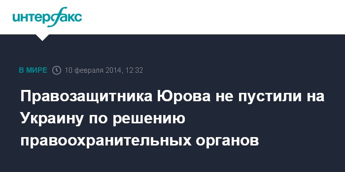 Москва. 10 февраля. INTERFAX.RU - В Государственной пограничной службе Украины заявили, что не впустили члена российского президентского совета по правам человека, эксперта Московской Хельсинкской группы Андрея Юрова на украинскую территорию в связи с соответствующим поручением правоохранительного органа этой страны.
