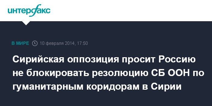 Москва. 10 февраля. INTERFAX.RU - Представители сирийской оппозиции в понедельник обратились к властям РФ с призывом не блокировать проект резолюции по налаживанию "гуманитарных коридоров" в Сирии, который Франция намерена направить в СБ ООН в ближайшее время.