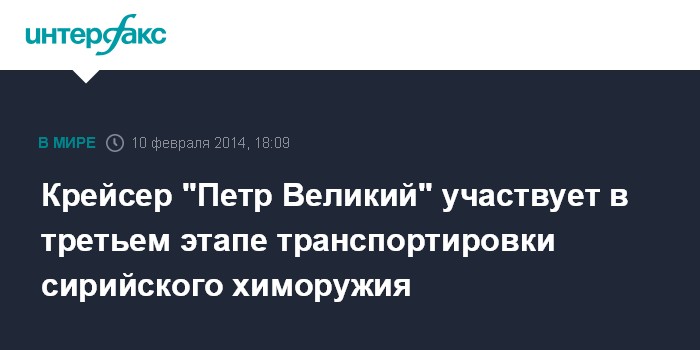 Москва. 10 февраля. INTERFAX.RU - Тяжелый атомный ракетный крейсер Северного флота "Петр Великий", который возглавляет оперативное соединение российского ВМФ в Средиземном море, принимает участие в обеспечении безопасности третьего этапа транспортировки сирийского химического оружия.