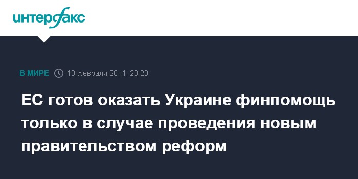 Брюссель. 10 февраля. INTERFAX.RU - Финансовая помощь Украине со стороны ЕС и международных финансовых институций (МФИ) будет оказана в случае проведения реформ новым правительством.