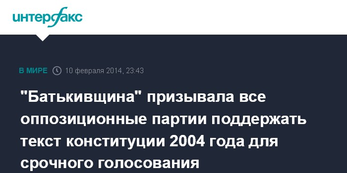 Киев. 10 февраля. INTERFAX.RU - "Батькивщина" призывает всех своих партнеров по оппозиции в Раде поддержать 150 подписями текст конституции 2004 года для срочного внесения его на голосование в Верховную раду.