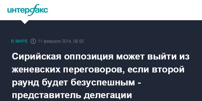 Москва. 11 февраля. INTERFAX.RU - Делегация сирийской оппозиции может выйти из межсирийских переговоров в Женеве, если второй раунд не принесет конкретных результатов, заявил представитель оппозиционной делегации на переговорах Луэй Сафи.