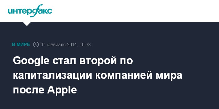 Москва. 11 февраля. INTERFAX.RU - Интернет-гигант Google Inc. по итогам торгов в США в понедельник впервые в своей истории занял второе место по капитализации среди самых дорогих компаний мира, обогнав нефтегазовую Exxon Mobil Corp. Лидером с существенным отрывом остается Apple Inc., сообщает агентство Bloomberg.