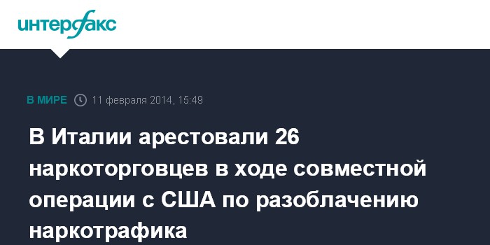 Москва. 11 февраля. INTERFAX.RU - Сотрудники правоохранительных органов Италии и США арестовали во вторник более двух десятков человек в ходе совместной операции по разоблачению сети наркотрафика, организованной нью-йоркским мафиозным "кланом Гамбино" и итальянской группировкой "Ндрангета", сообщают итальянские СМИ.