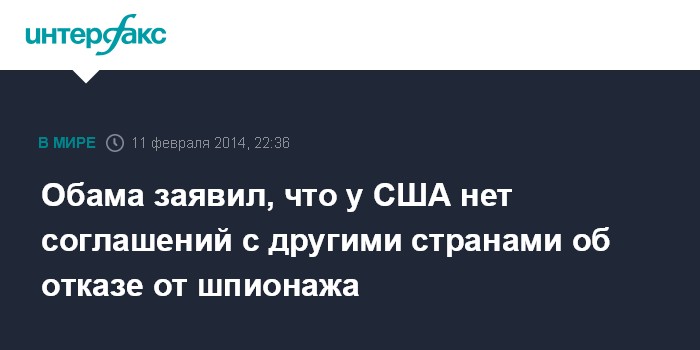 Москва. 11 февраля. INTERFAX.RU - Президент США Барак Обама заявил, что Вашингтон "не заключал ни с одной страной соглашение об отказе от шпионажа", сообщает во вторник агентство AP.