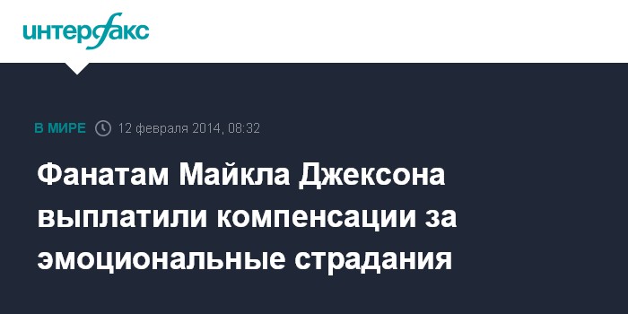 Лондон. 12 февраля. INTERFAX.RU - Пятеро поклонников американского певца Майкла Джексона по решению французского суда получили компенсации в размере одного евро за "эмоциональный ущерб", причиненный им смертью певца.