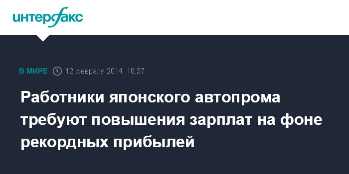 Москва. 12 февраля. INTERFAX.RU - Профсоюзы работников автопрома Японии настаивают на увеличении окладов и бонусов на фоне прогнозов рекордных прибылей компаний сектора в текущем году, сообщает агентство Bloomberg.
