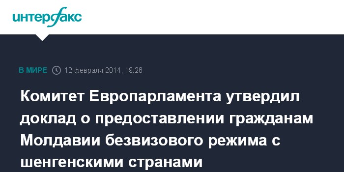 Москва. 12 февраля. INTERFAX.RU - Комитет Европарламента по вопросам гражданских свобод, юстиции и внутренних дел утвердил в среду доклад о предоставлении безвизового режима со странами Шенгенского соглашения гражданам Молдавии, являющимся обладателями биометрических паспортов.
