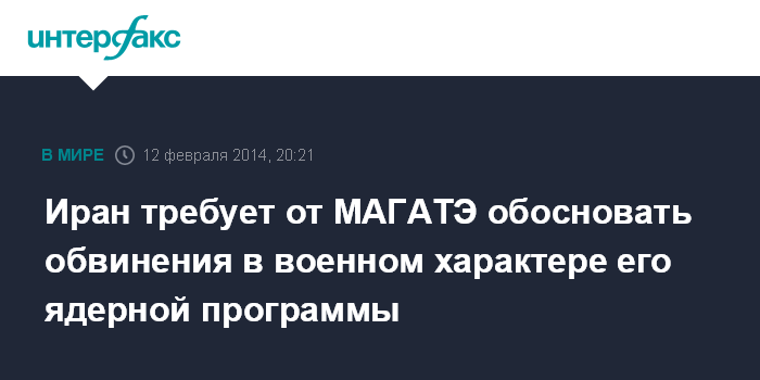Москва. 12 февраля. INTERFAX.RU - Тегеран считает недопустимыми выдвигаемые МАГАТЭ обвинения в том, что иранская ядерная программа носит военный характер, если при этом не представлено никаких доказательств, передают в среду иранские СМИ.