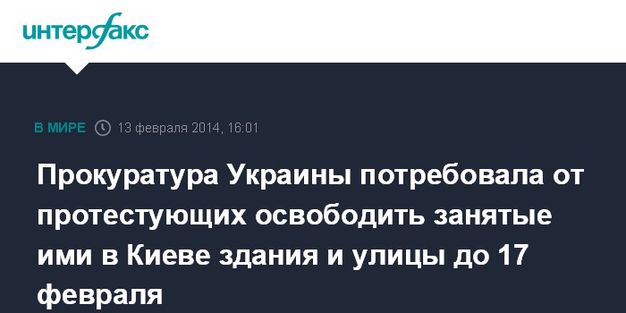Прокуратура Украины потребовала от протестующих освободить занятые ими в Киеве здания и улицы до 17 февраля