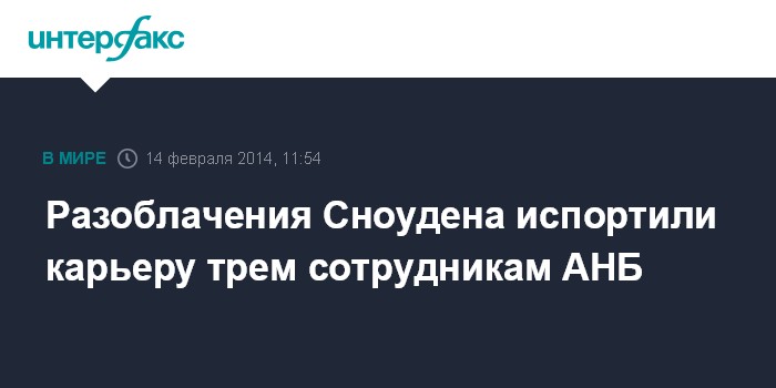 Москва. 14 февраля. INTERFAX.RU - Три сотрудника Агентства национальной безопасности (АНБ) США пострадали в результате скандала с утечками секретной информации, организованными бывшим сотрудником этой спецслужбы Эдвардом Сноуденом, сообщил американский телеканал NBC.