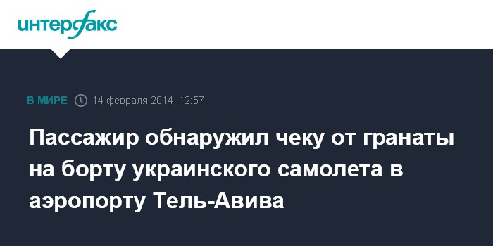 Москва. 14 февраля. INTERFAX.RU - Пассажиры самолета украинской авиакомпании в аэропорту "Бен-Гурион" были эвакуированы после того, как один из них обнаружил чеку от гранаты, сообщает в пятницу израильская газета Jerusalem Post.