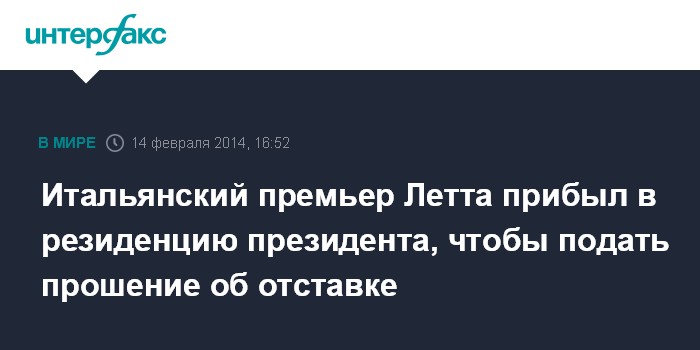 "Принимая во внимание решения, принятые на съезде Демократической партии, я оповестил президента страны Джорджо Наполитано о том, что завтра (в пятницу - ИФ) я уйду в отставку вместе со своим кабинетом", - говорится в заявлении, которое Летта сделал накануне.