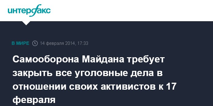 Киев. 14 февраля. INTERFAX.RU - Несколько сотен активистов самообороны Майдана прибыли к зданию Генпрокуратуры Украины с требованием закрыть начатые в отношении их соратников уголовные производства.