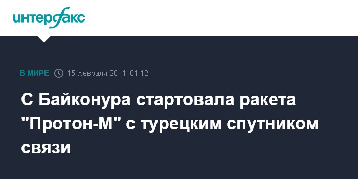 Москва. 15 февраля. INTERFAX.RU - Ракета-носитель "Протон-М" с турецким космическим аппаратом связи TurkSat-4А стартовала с космодрома Байконур (Казахстан) в ночь на субботу, сообщили "Интерфаксу-АВН" в субботу в пресс-службе Роскосмоса.