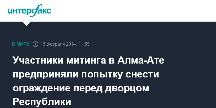Москва. 15 февраля. INTERFAX.RU - Участники митинга, собравшиеся в субботу у площади перед дворцом Республики в Алма-Ате, попытались снести ограждение и прорваться на саму площадь, передал корреспондент агентства "Интерфакс-Казахстан". Сотрудники полиции сдерживают натиск. К площади стягиваются дополнительные наряды полиции.
