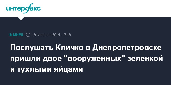 Москва. 16 февраля. INTERFAX.RU - В парке им.Глобы в Днепропетровске задержаны мужчины, которые стояли перед трибуной, где выступал лидер партии "УДАР" Виталий Кличко, и пытались облить политика зеленкой.