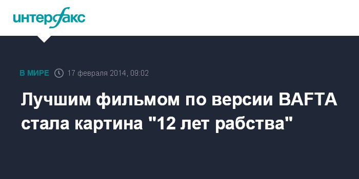 Москва. 17 февраля. INTERFAX.RU - Картина британского режиссера Стива Маккуина получила награду за лучший фильм в 2014 году, сообщается на сайте британской академии кино и телевизионных искусств(BAFTA).
