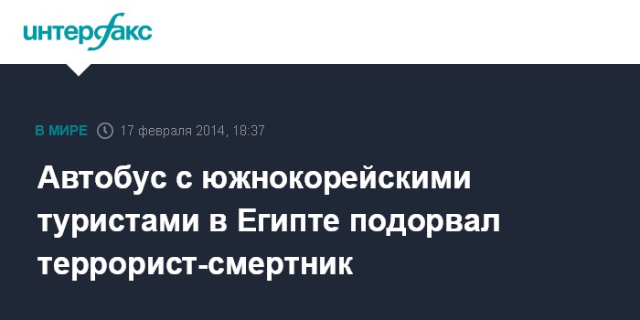 Москва. 17 февраля. INTERFAX.RU - Произошедшее в воскресенье нападение на автобус с южнокорейскими туристами в Египте совершил террорист-смертник, передает агентство Associated Press со ссылкой на египетских следователей.