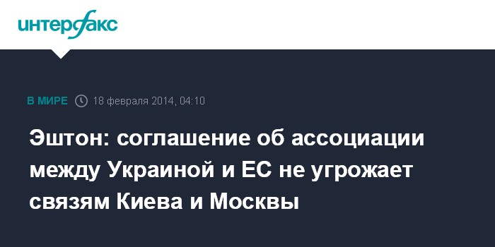 Москва. 18 февраля. INTERFAX.RU - Соглашение об ассоциации между Украиной и Евросоюзом не несет угрозы интересам России, считает верховный представитель ЕС по внешней политике Кэтрин Эштон.