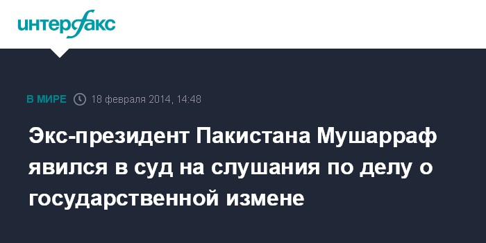 Москва. 18 февраля. INTERFAX.RU - Суд в Пакистане во вторник начал рассмотрение дела о государственной измене, фигурантом которого является бывший президент страны Первез Мушарраф, сообщает индийский телеканал NDTV.