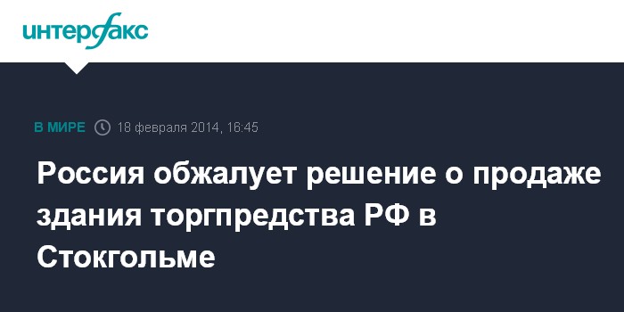 Москва. 18 февраля. INTERFAX.RU - Российская сторона обжалует итоги прошедшего в Швеции аукциона по продаже здания торгпредства РФ в Стокгольме по иску немецкого бизнесмена Франца Зидельмайера, сообщил пресс-секретарь управделами президента РФ Виктор Хреков.